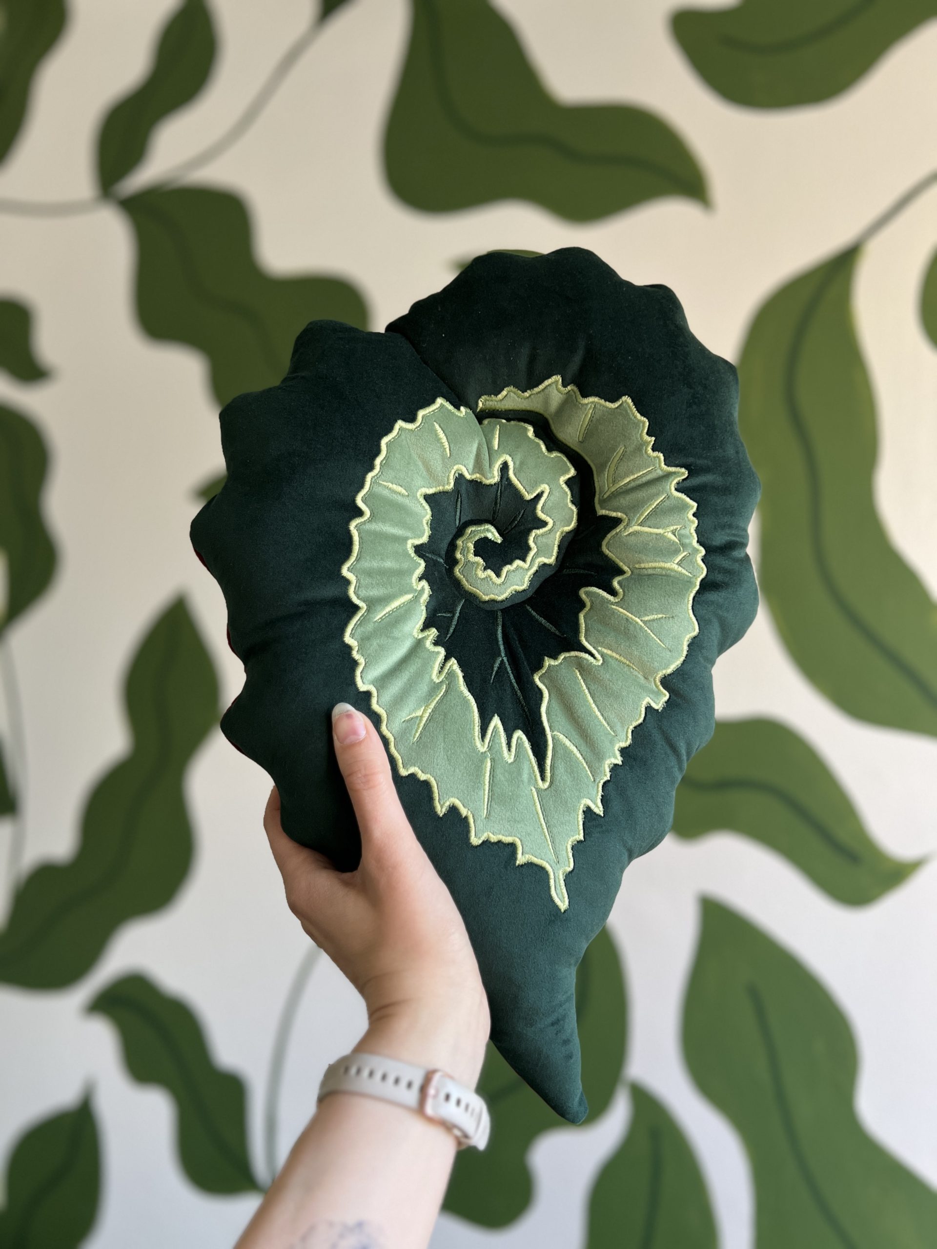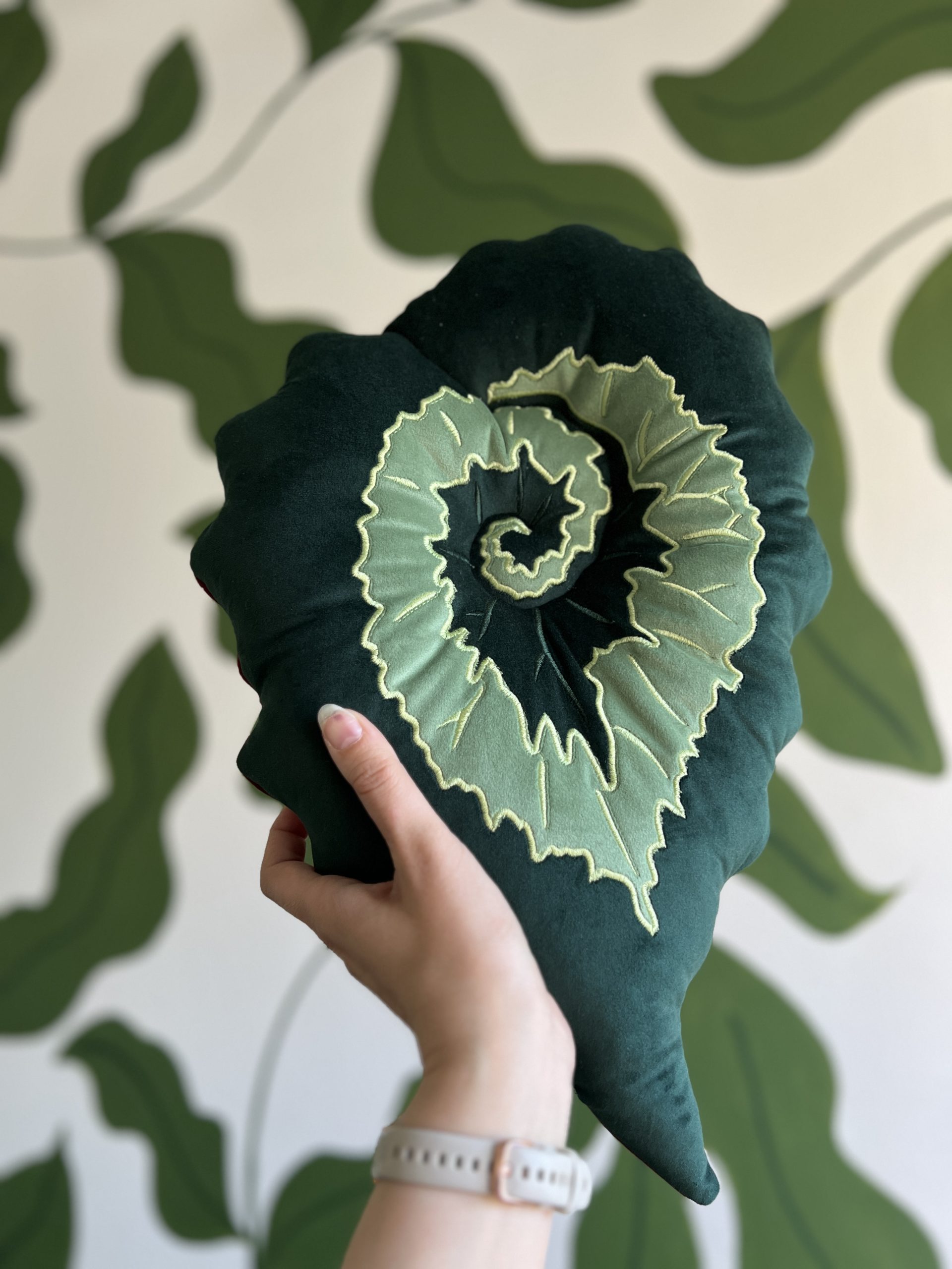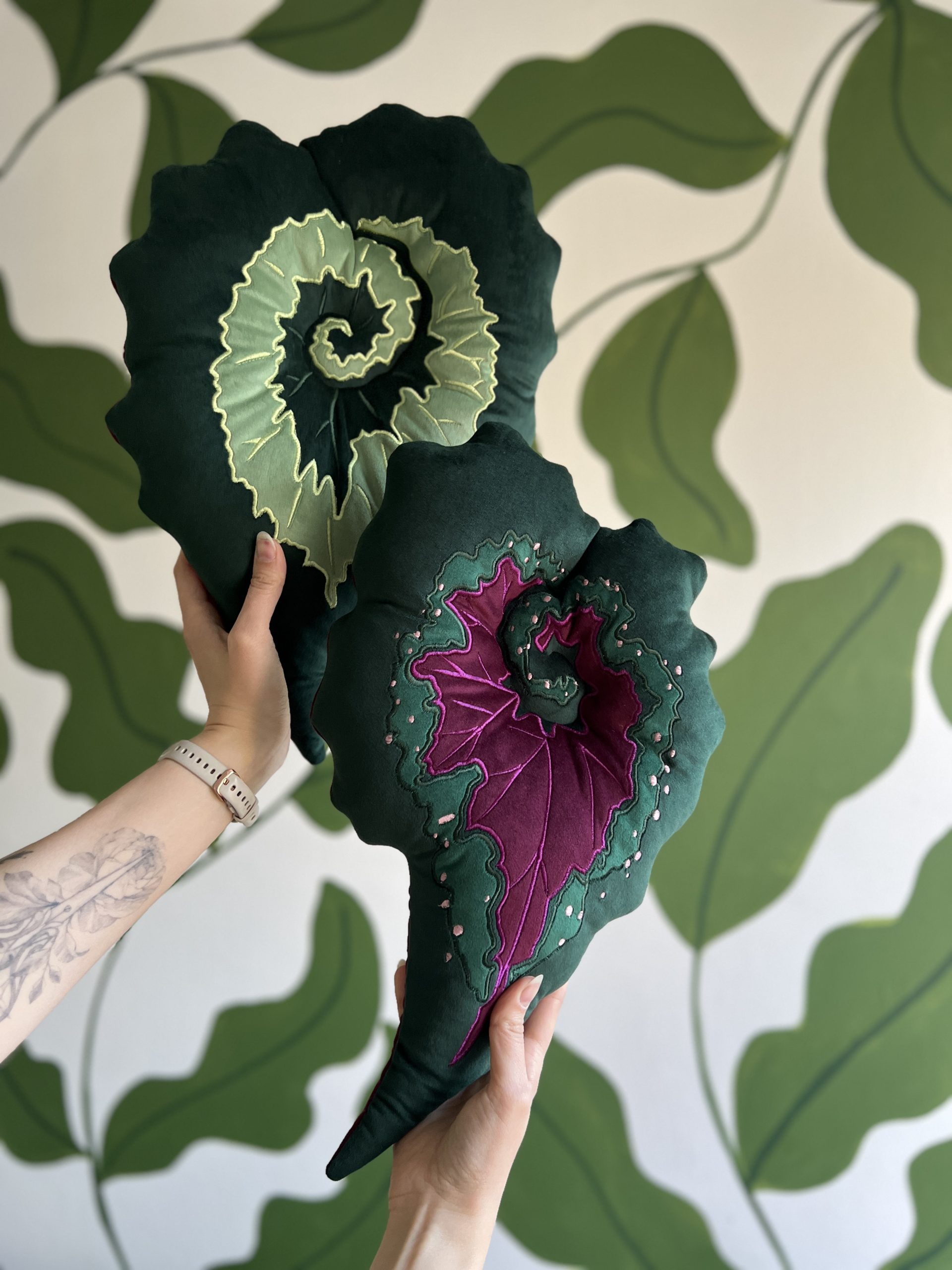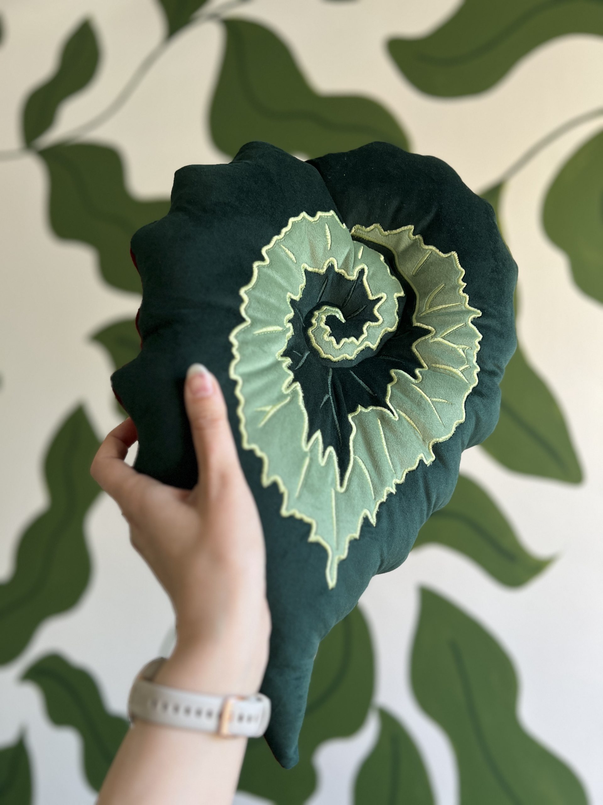 Wprowadź do wnętrza odrobinę charakteru dzięki tej wyjątkowej poduszce inspirowanej Begonią Rex Escargot. Głębokie odcienie zieleni zestawione z jaśniejszymi, subtelnie kontrastującymi warstwami tworzą hipnotyzujący, spiralny układ liścia, który przyciąga uwagę i nadaje całości artystycznego wyrazu.
