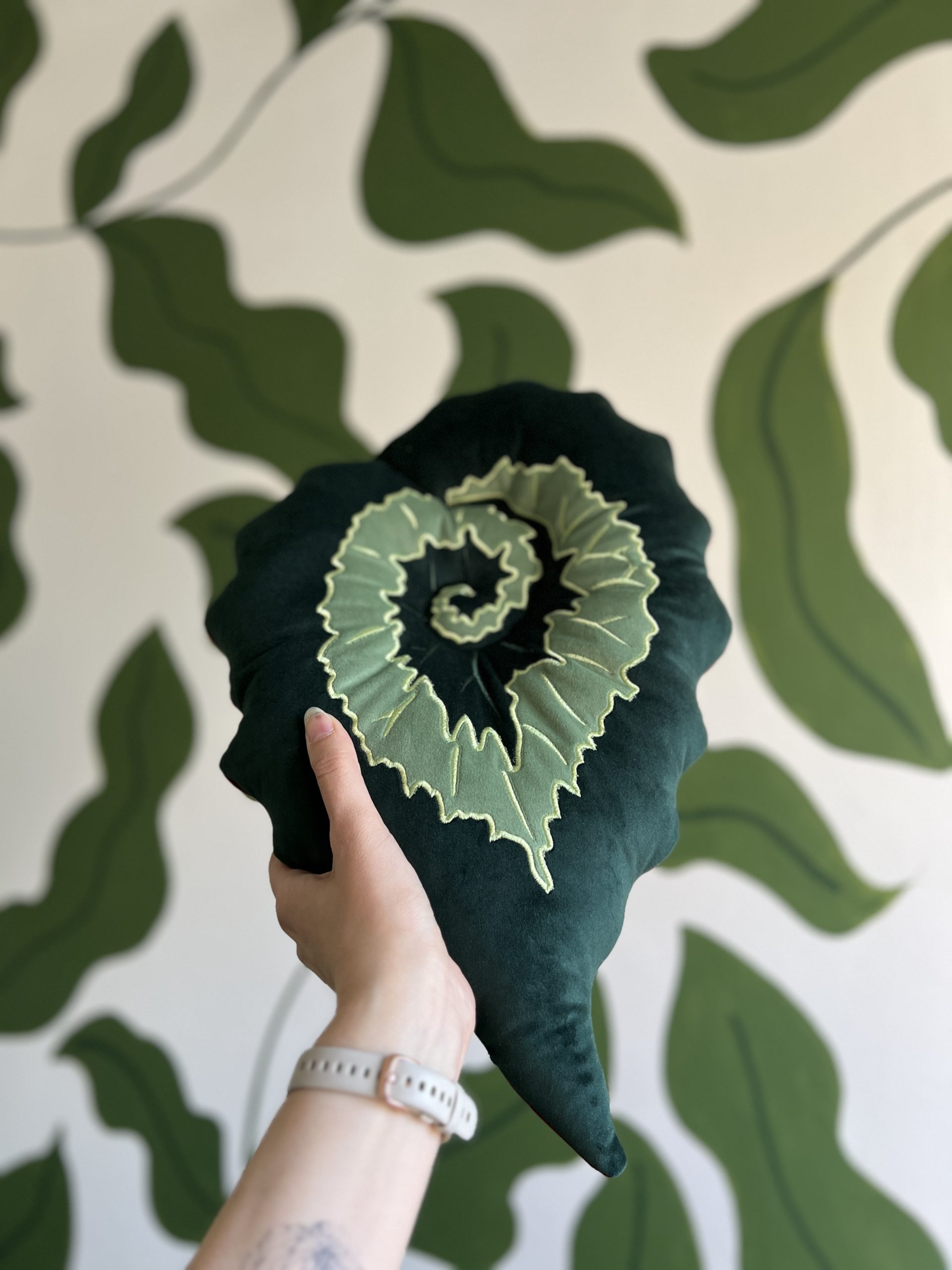 Każda poduszka powstaje ręcznie z wysokiej jakości, miękkiej tkaniny o aksamitnym wykończeniu. Staranny haft maszynowy oddaje strukturę nerwów liścia, a warstwowe elementy budują efekt trójwymiarowości, nadając formie niemal rzeźbiarski charakter. Wyraźne przeszycia i dopracowane detale podkreślają dekoracyjność projektu.