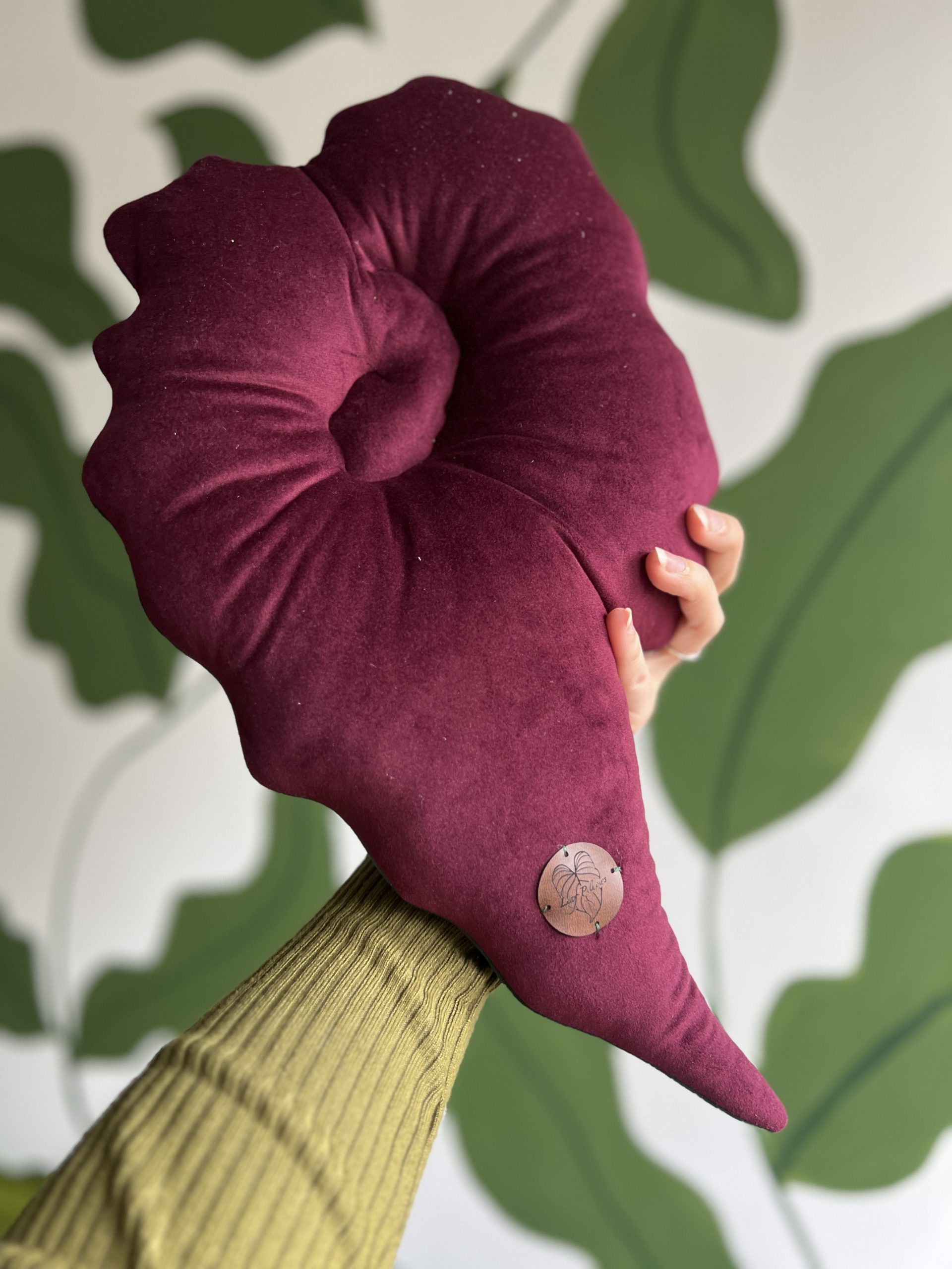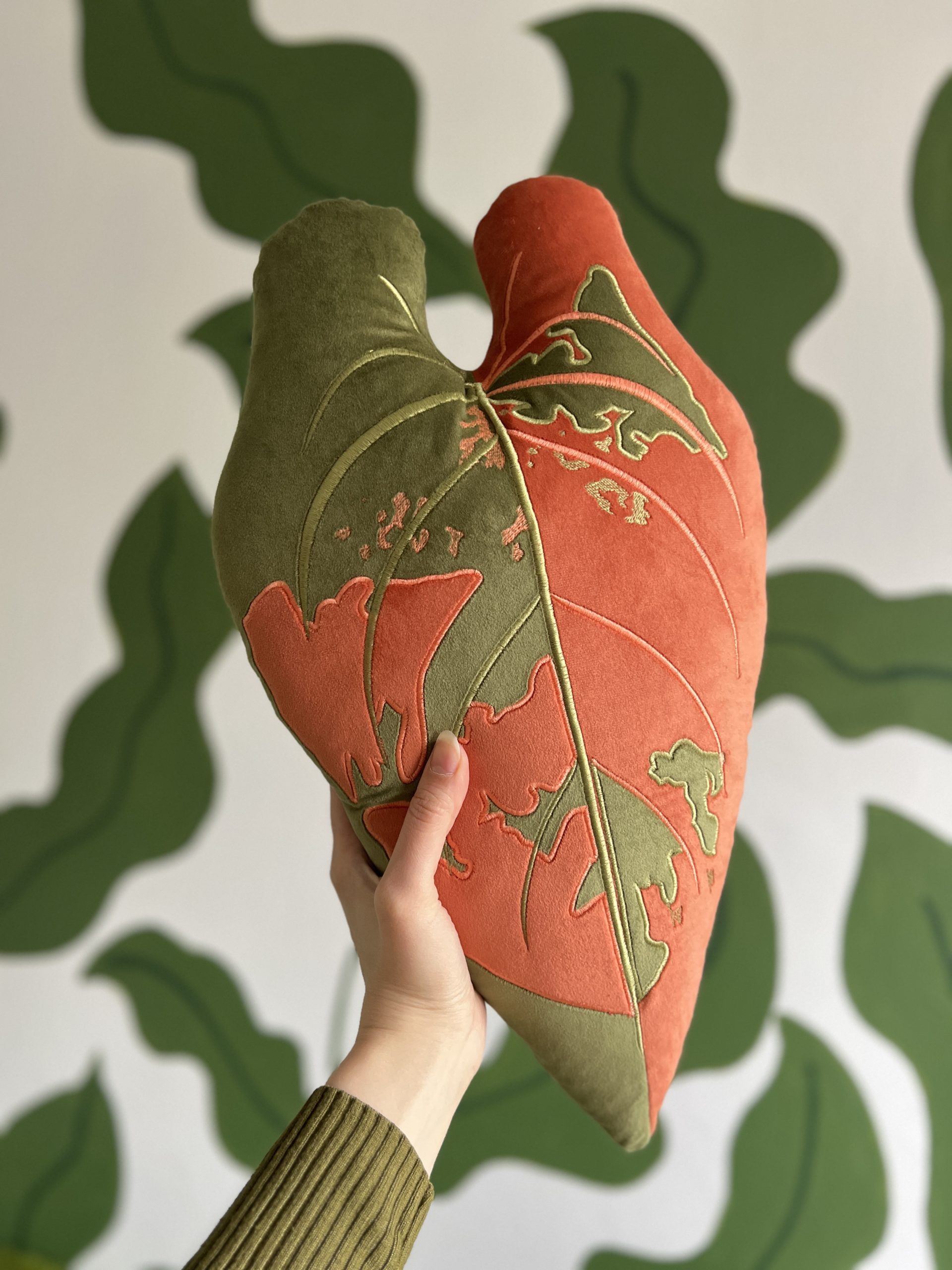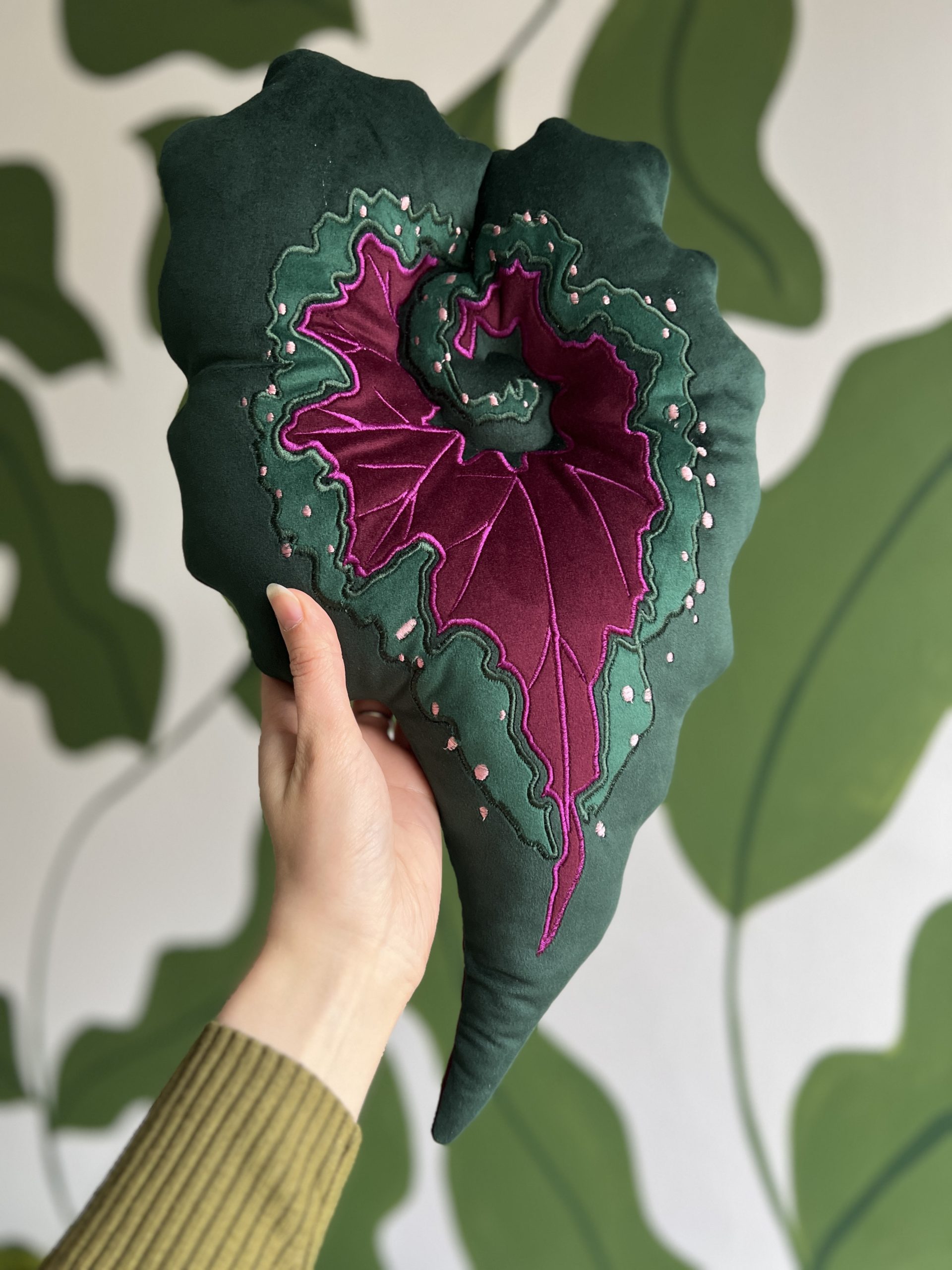 Poduszka została wykonana ręcznie z wysokiej jakości, miękkiej tkaniny o aksamitnym wykończeniu. Haft maszynowy precyzyjnie odwzorowuje nerwy liścia, a warstwowe aplikacje tworzą trójwymiarowy, niemal rzeźbiarski efekt. Dodatkowe haftowane detale nadają całości wyjątkowego, dekoracyjnego charakteru.