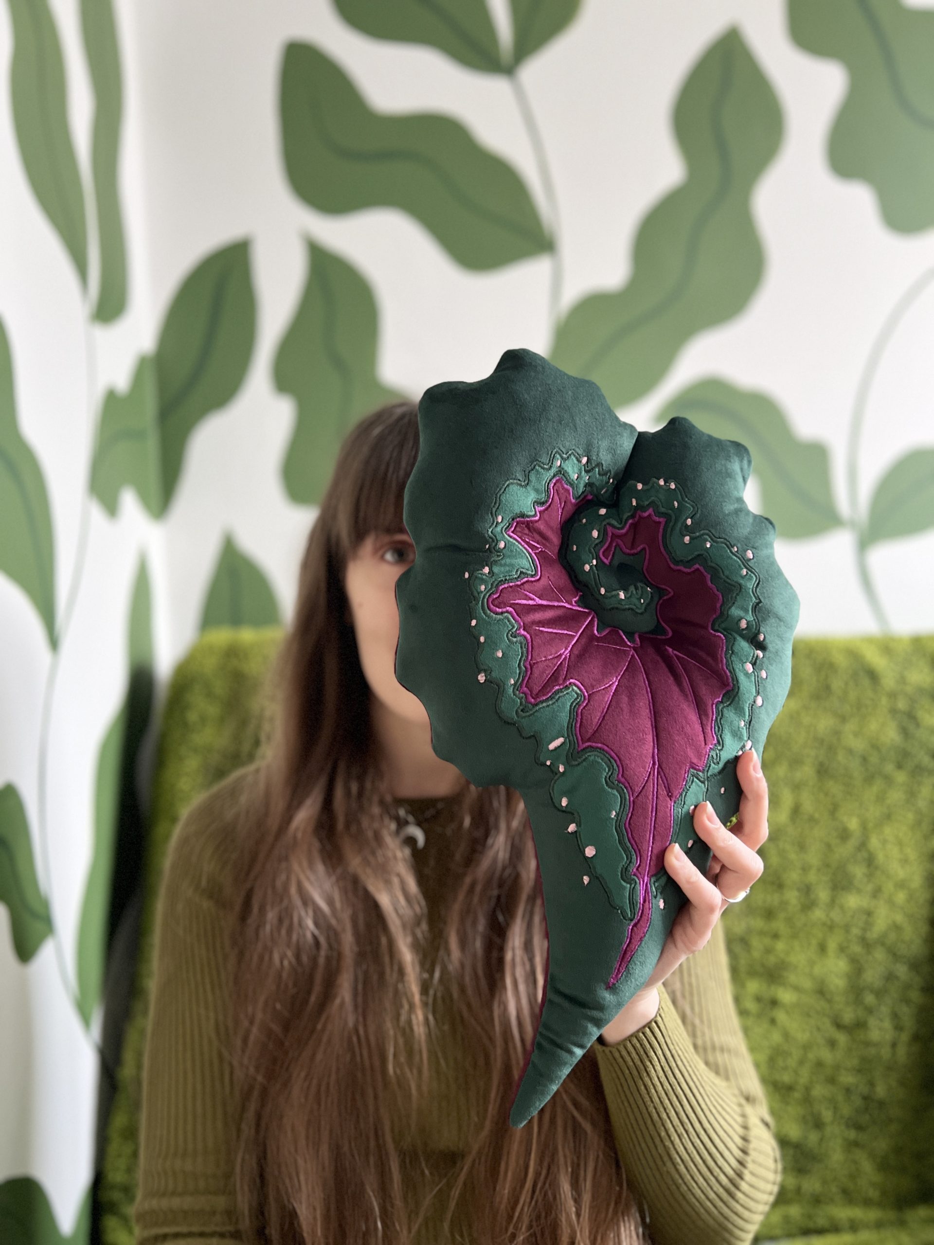 Dodaj wnętrzu wyrazistości dzięki tej efektownej poduszce inspirowanej niezwykłą Begonią Rex. Intensywne połączenie głębokiej zieleni i nasyconego, fioletowego środka oddaje charakterystyczny, artystyczny wygląd tej rośliny.